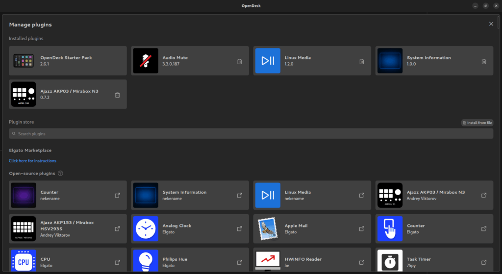 Für Linux gibt es meiner Recherche nach grob zwei Projekte: OpenDeck (729 Stars) und StreamController (764 Stars) (diese Hilflosigkeit, wenn die Metrik zur Entscheidung zwischen Github-Projekten so gleichauf liegt). Ich habe mich für OpenDeck entschieden und war ob der leichten Installation sehr überrascht. Vom Projekt wird ein deb-File angeboten (nur eine apt-Quelle wäre noch schöner gewesen!) und für die unterschiedlichen Decks gibt es diverse Plugins. Für selbige bringt OpenDeck eine Art App-Store mit: